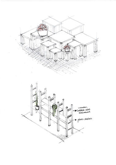 The flower shop's design incorporates multi-level flexibility to accommodate seasonal changes. This is accomplished through the use of interior furniture for the central display and shelving, adjustable track lighting, and a fog system to regulate the shop's temperature. The townhouse's refurbishment focuses on adaptive reuse through environmental design. One example is the townhouse's central garden, which improves air circulation using the stack effect. This effect is also present through the existing vertical passive vents in one of the walls, as well as the newly installed skylight.